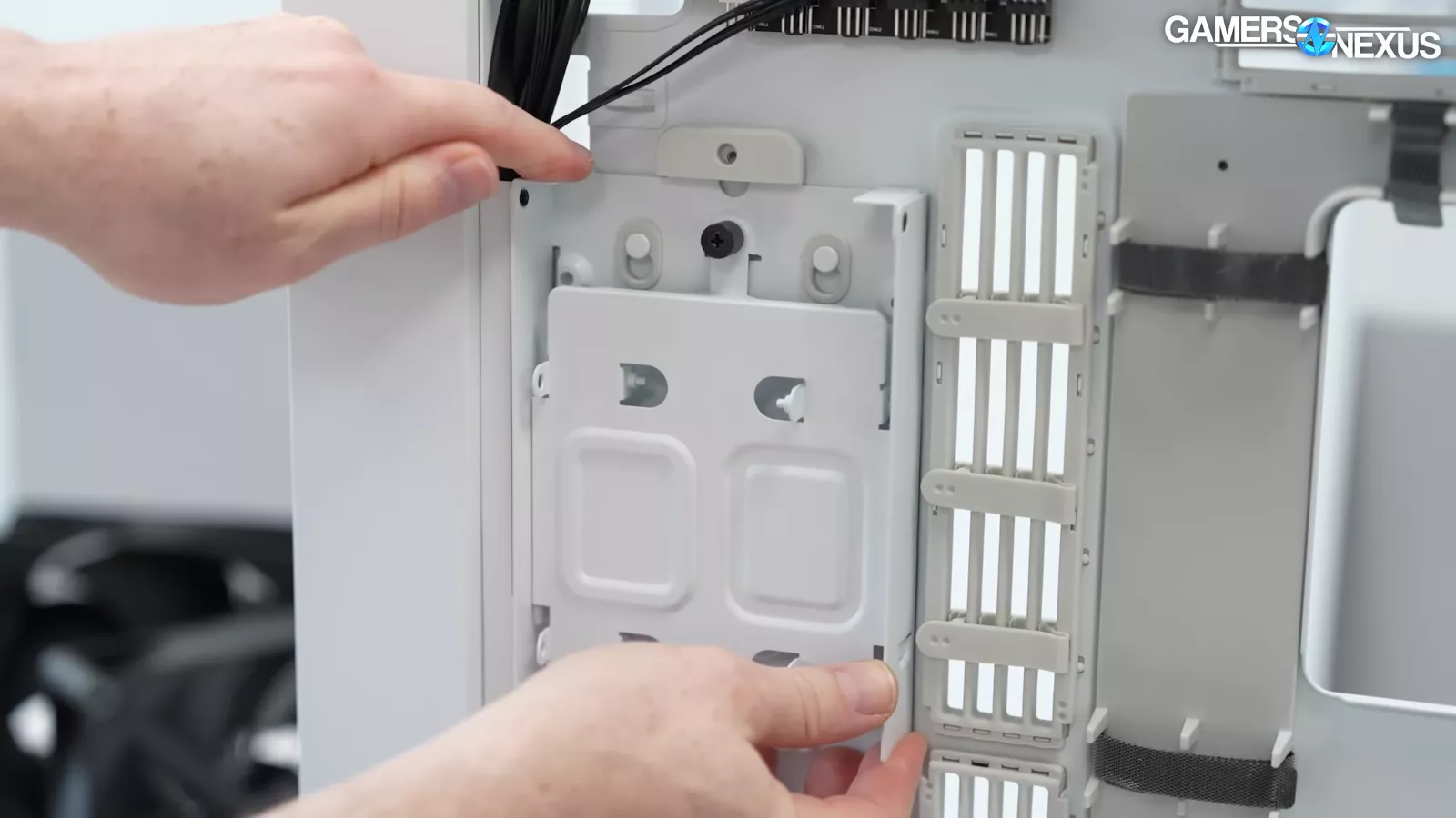 HAVN learned from the HS 420 on the 3 and ½-inch drive support and improved its implementation. There are 2 bays on the back side of the case for those drives and they can be removed. HAVN also changed how it handles the grommets with the case. The string-like material in between is the same but there’s now a little rubber tab that helps to prevent it from popping out by accident once it’s filled with cables. The point here is that HAVN is trying to learn from what they’ve done with the HS 420 and to refine their designs.