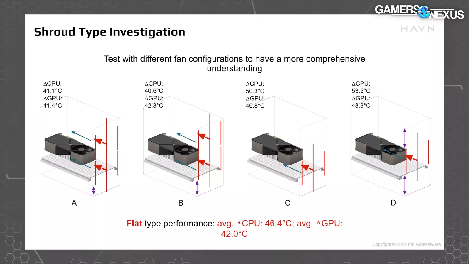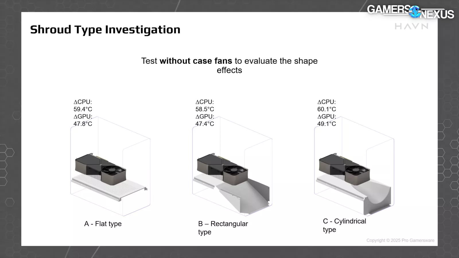 Thermal comparisons should only be made against their own results here, not against ours, as the benches are different. The flat, typical shroud style was comparable to the rectangular type in result, with the rectangular type slightly better. We think this will see a larger impact in our testing, but we'd need the three types to know for sure. The important comparison is against the cylindrical type, where HAVN saw worse results by a measurable amount. Performance worsened by 1-2 degrees on the CPU and about 2 degrees on the GPU. That's a large GPU temperature increase.