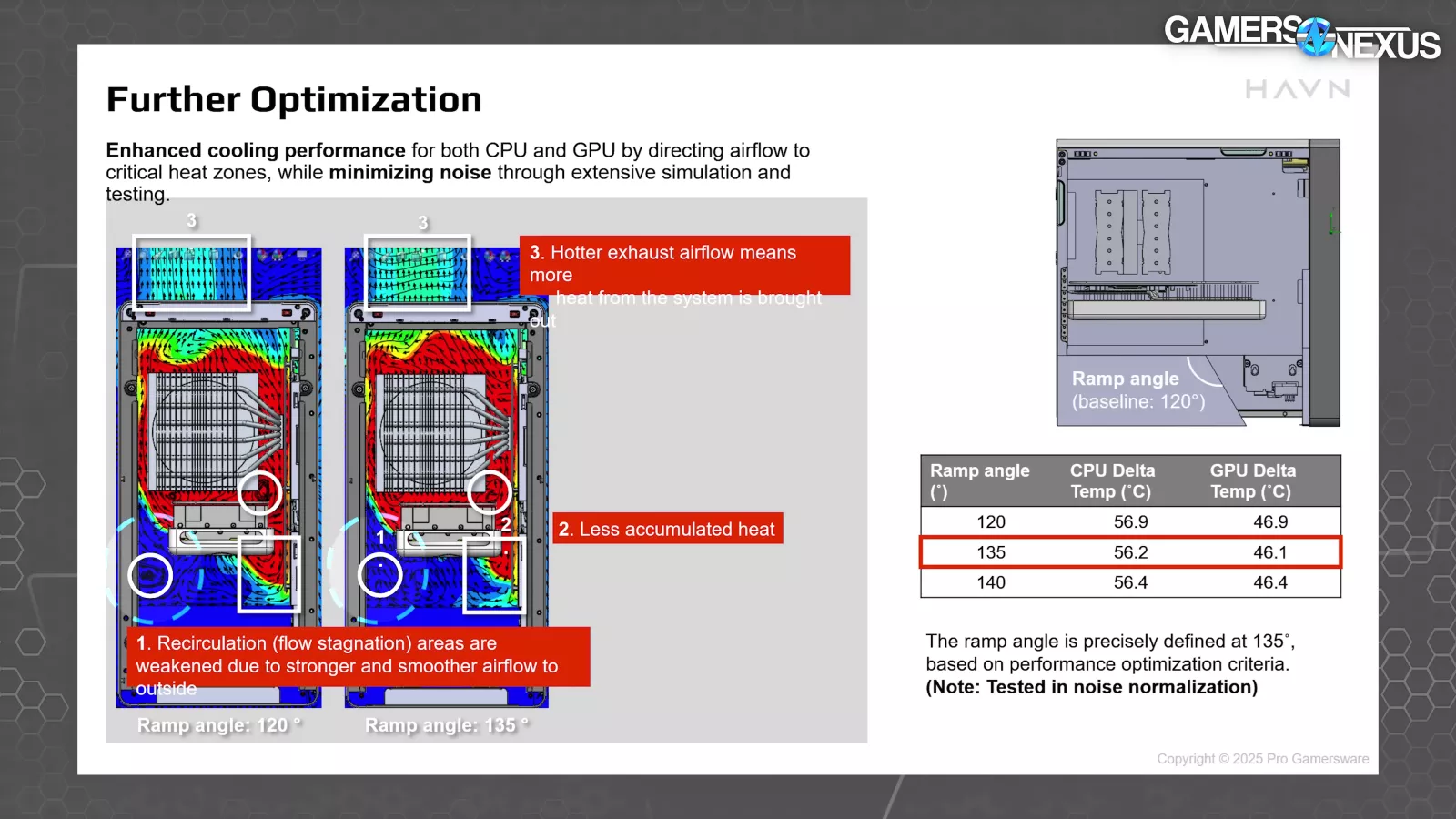 This slide shows CFD simulation and flow mapping for ramp angles at 120 and 135 degrees. HAVN has drawn a few highlights around areas of re-circulation or heat accumulation, particularly marked at "1" where the 120-degree ramp angle shows worse areas of heat build-up. HAVN tested this in 5-degree increments from 120 to 140, finding that 135 was a good balance when noise normalized.