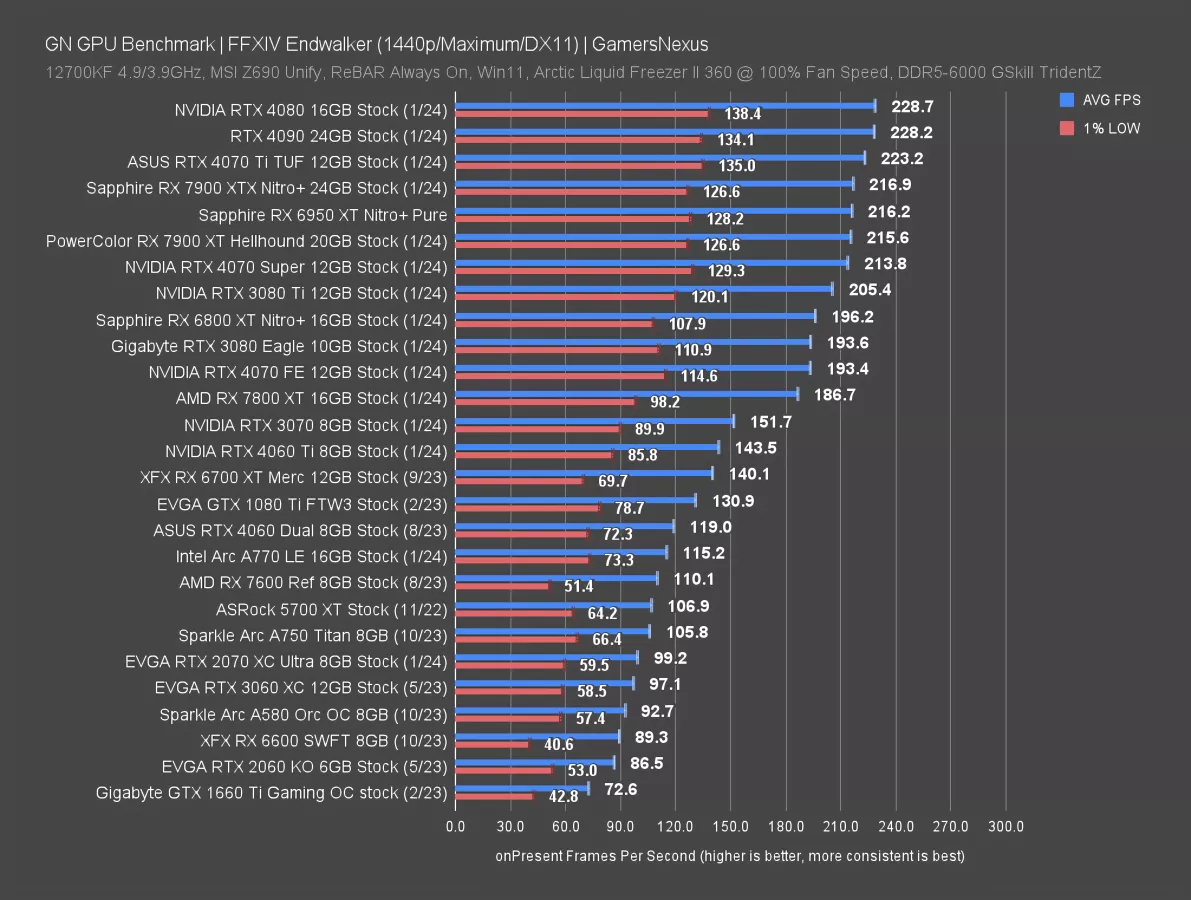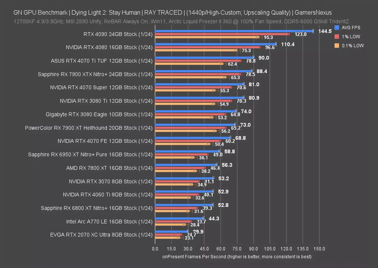 At 1440p, the 4090 illustrates that we have plenty of room to measure the 70-class cards and establishes a large gap between itself and the next card down, which is the 7900 XTX.