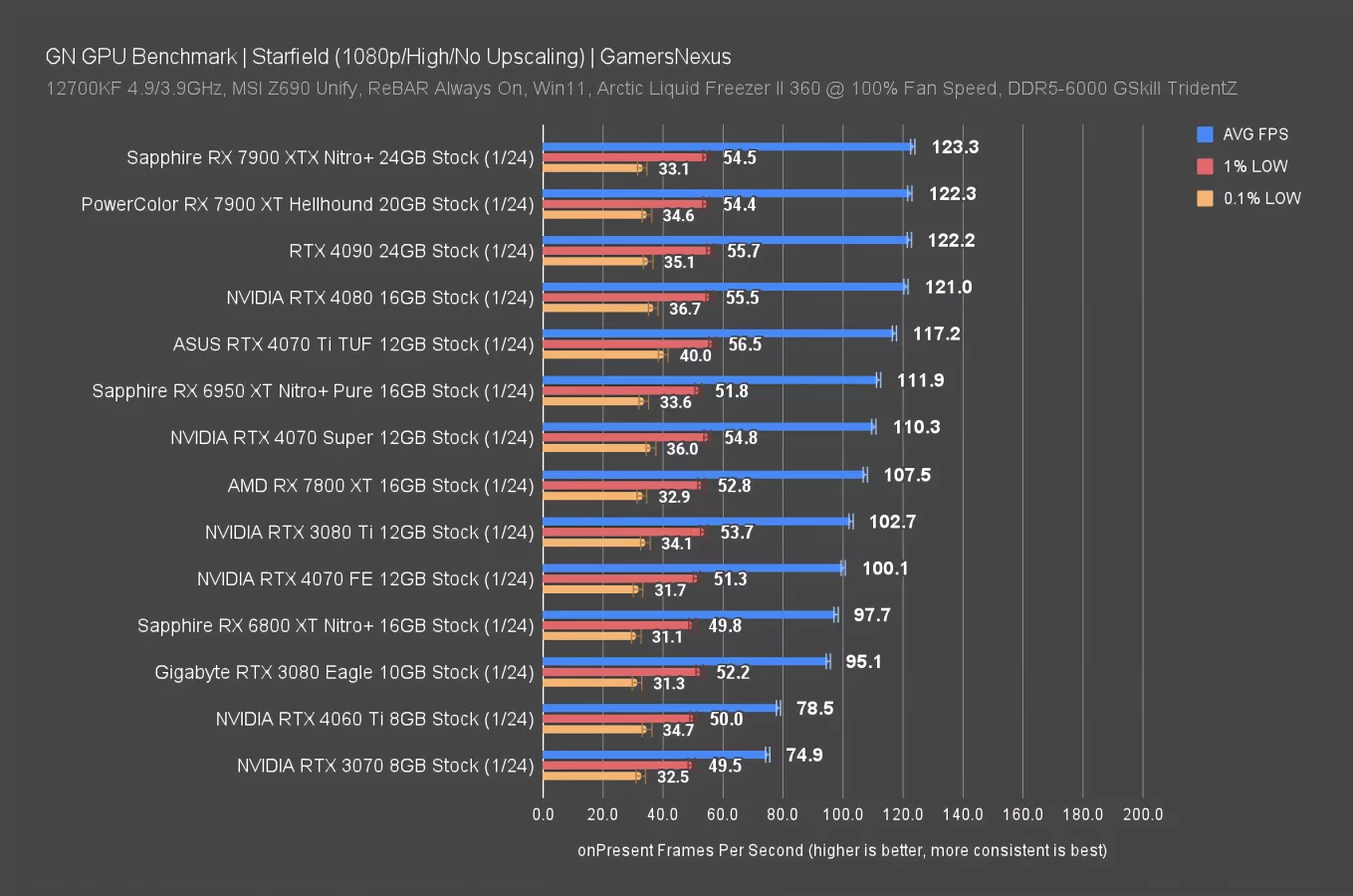AMD still has a strong position in Starfield for GPUs, even with all the recent patches. AMD’s cards were ahead at launch and they remain comparatively well positioned now. The 7900 XT leads the 4070 Ti by about 10FPS and the 4070 Super by 30%, but the 7900 XT also costs around $750 right now. At $500, the 7800 XT roughly ties the 4070 Super in these tests, positioned just ahead of the 3080 and 6800 XT.