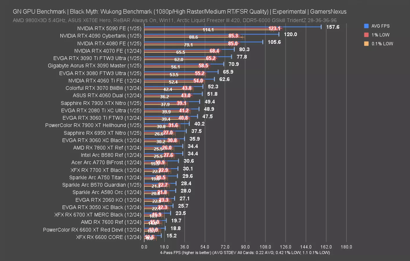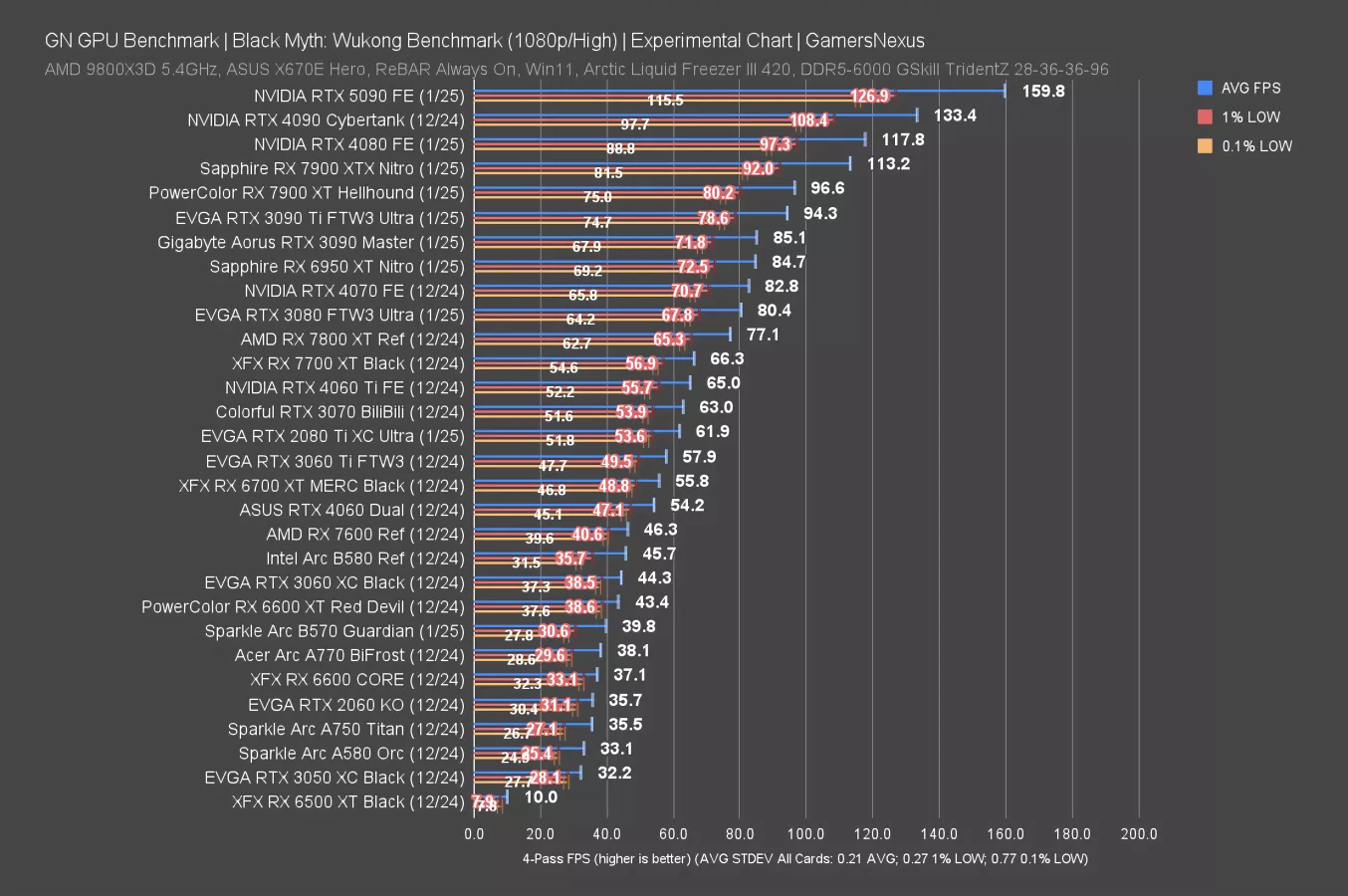 Black Myth Wukong is heavy enough that 1080p still has some meaningful spacing, even without ray tracing. The RTX 5090 ran at 160 FPS AVG, with good frametime pacing establishing 127 FPS and 116 FPS lows. The 160 FPS result has it 20% ahead of the RTX 4090, diminishing the earlier lead (which was 28% at 4K, 23% at 1440p, and now 20%). This isn’t just a CPU limit, as we also saw in Final Fantasy, but speaks to other advantages on the 5090 especially at higher resolutions. We think the memory bandwidth is likely a large part of that additional scaling.