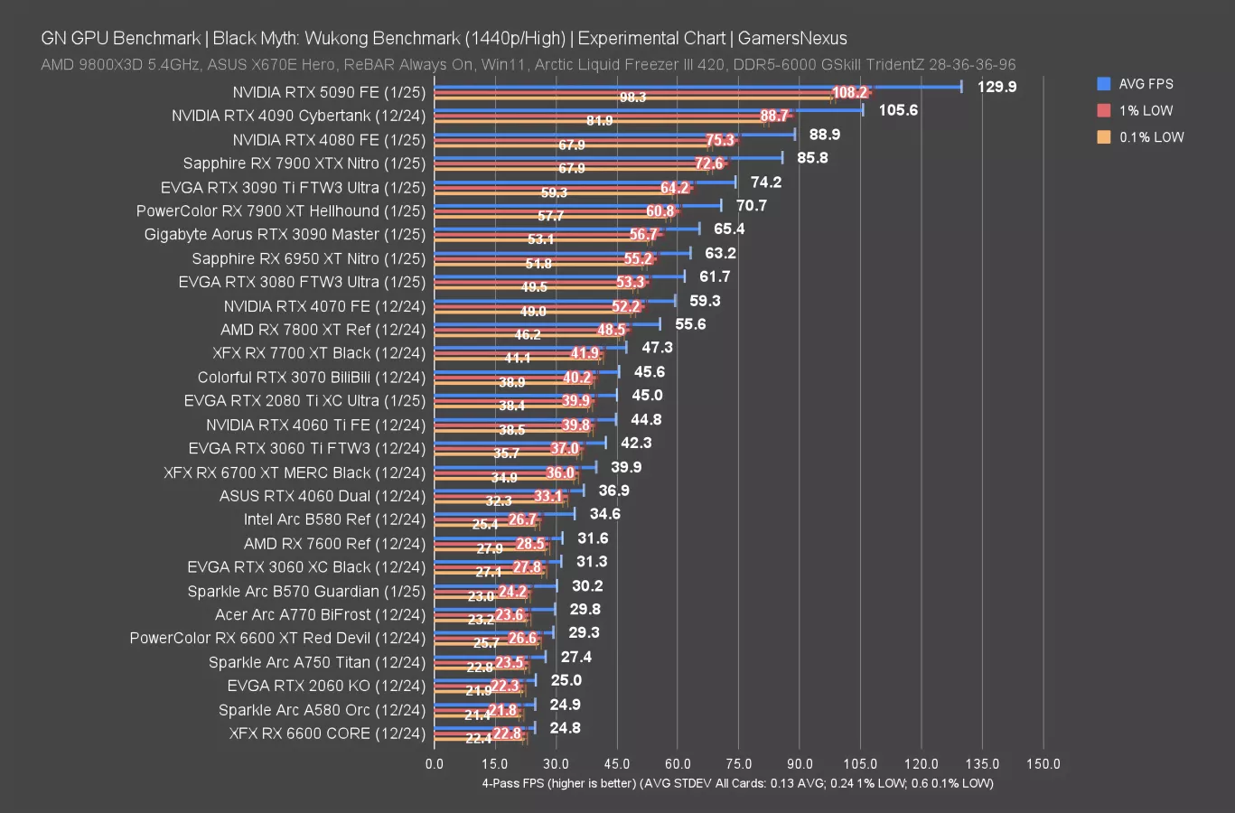 At 1440p, Black Myth has the RTX 5090 at 130 FPS AVG, 23% improved over the RTX 4090’s 106 FPS AVG. The lows also improve. The rapid rundown against other flagships is as follows:
