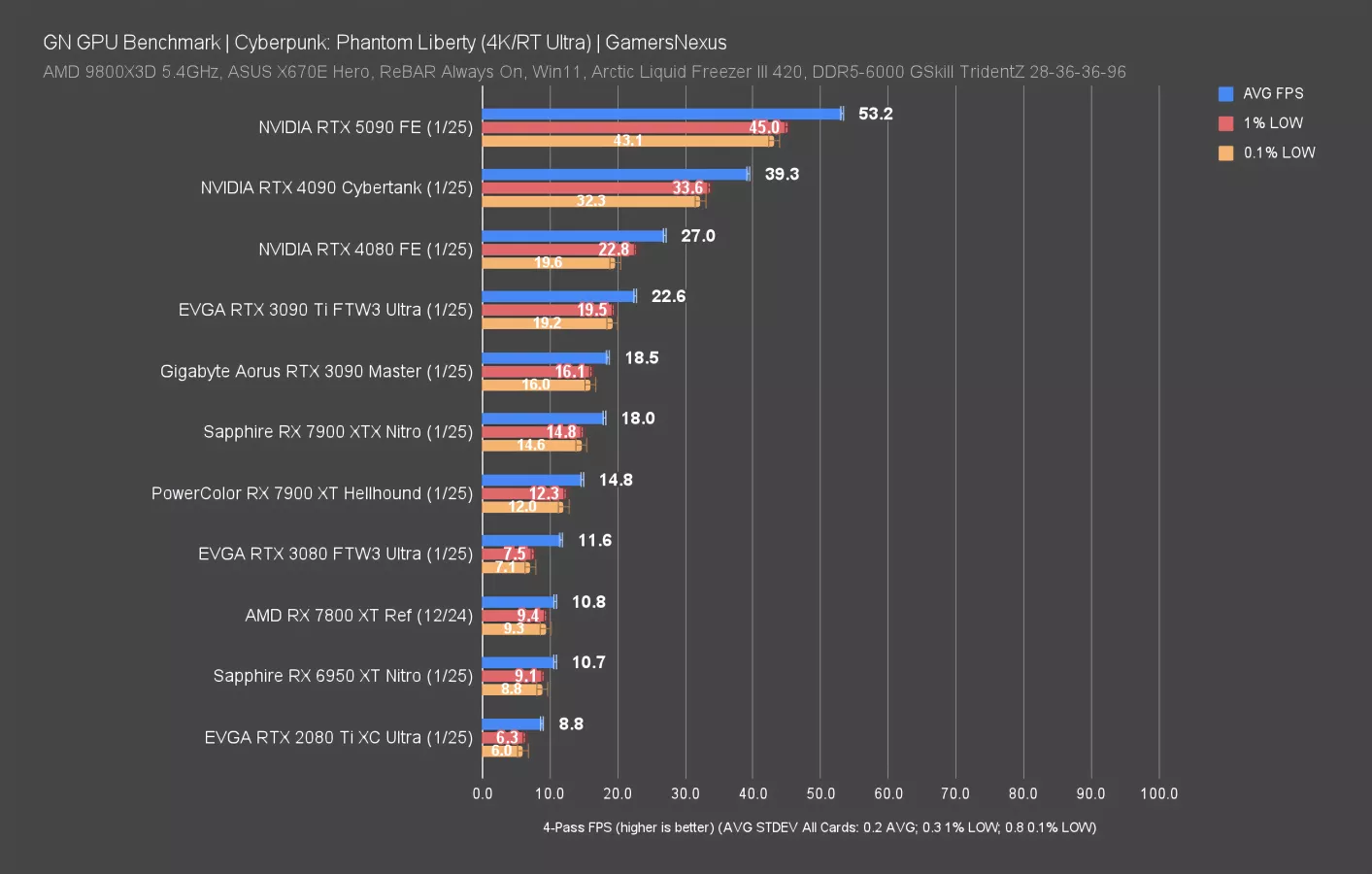 The RTX 4090 had a large 32% lead over the RTX 4080 already. As for the older cards, the 5090 and 3090 Ti are in entirely different classes. The 2080 Ti is down at 27 FPS AVG and struggling to run, although to its credit, its frametime pacing in relation to the average is excellent -- it’s just that the framerate is low.