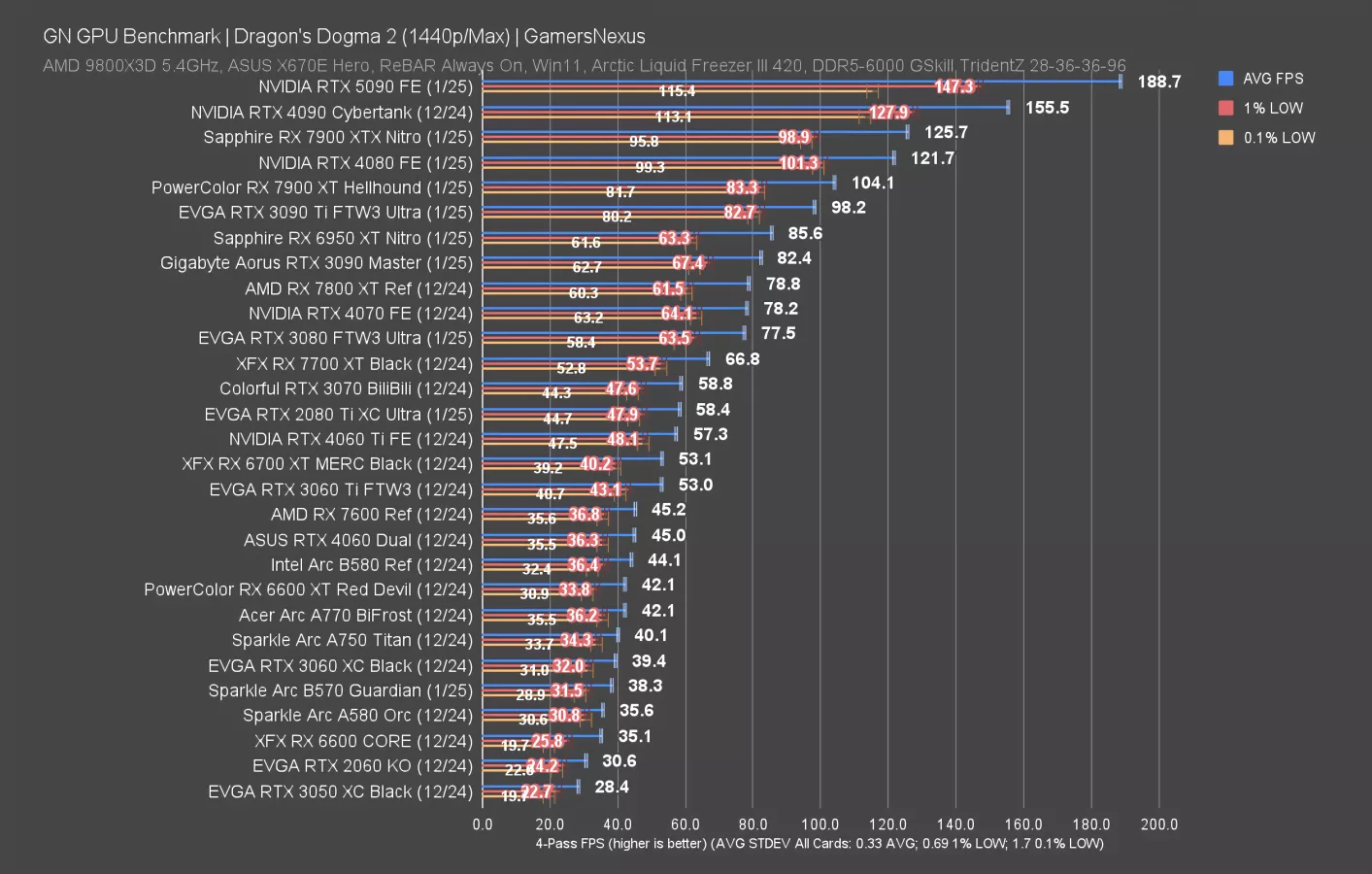 At 1440p, the 5090 jumped to 165 FPS AVG and the 4090 held 136 FPS AVG, still keeping about a 30 FPS gap between them, or an improvement generationally of 22%. The uplift has fallen as compared to 4K, keeping with prior trends. The 7900 XTX does similarly here to last time, landing just ahead of the RTX 4080 (watch our review).