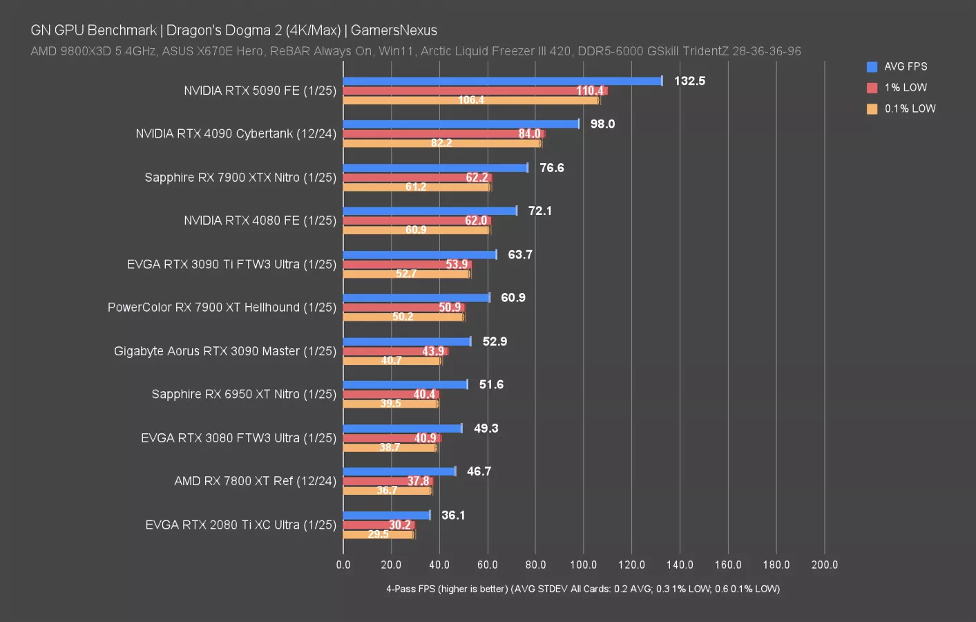 The 5090 has a 51% higher average framerate than the 7900 XTX, 75% higher than the 3090 Ti FTW3 (RIP EVGA), 99% higher than the RTX 3090 Master, and 189% higher than the RTX 2080 Ti former flagship.