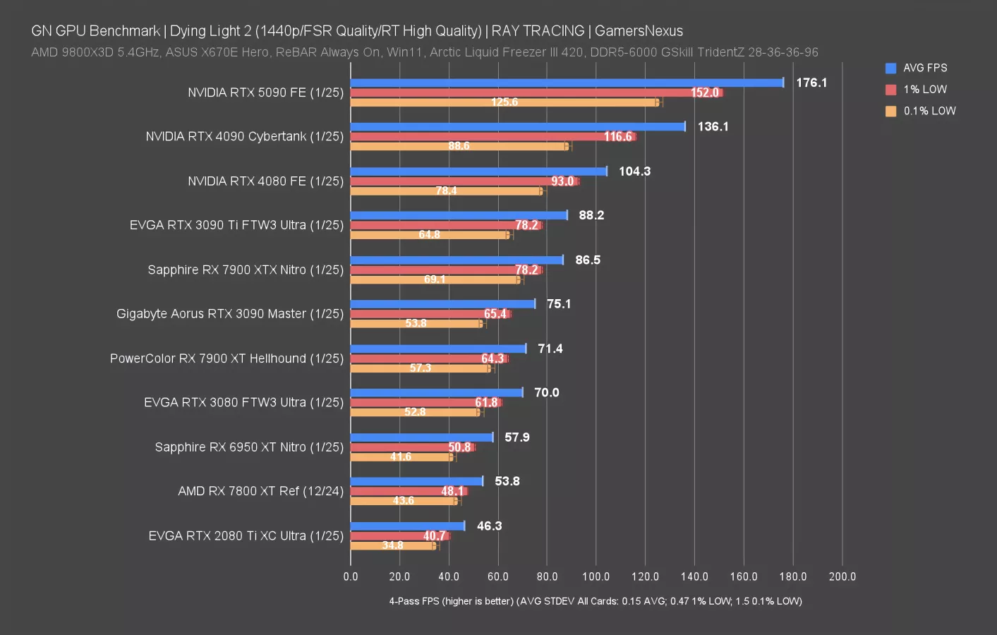 Here’s Dying Light 2 ray-traced. Again, we haven’t historically run 4K here because only the 4090 and 4080 could be argued as capable. It looks like this next generation of hardware -- and hopefully that also includes AMD’s next card -- is changing that. The RTX 5090 ran at 109 FPS AVG, leading the 80 FPS result of the 4090 by 37%. The 7900 XTX is led by 137%. AMD has publicly claimed that its next generation will significantly improve upon this, so we’ll see where they land probably closer to March.