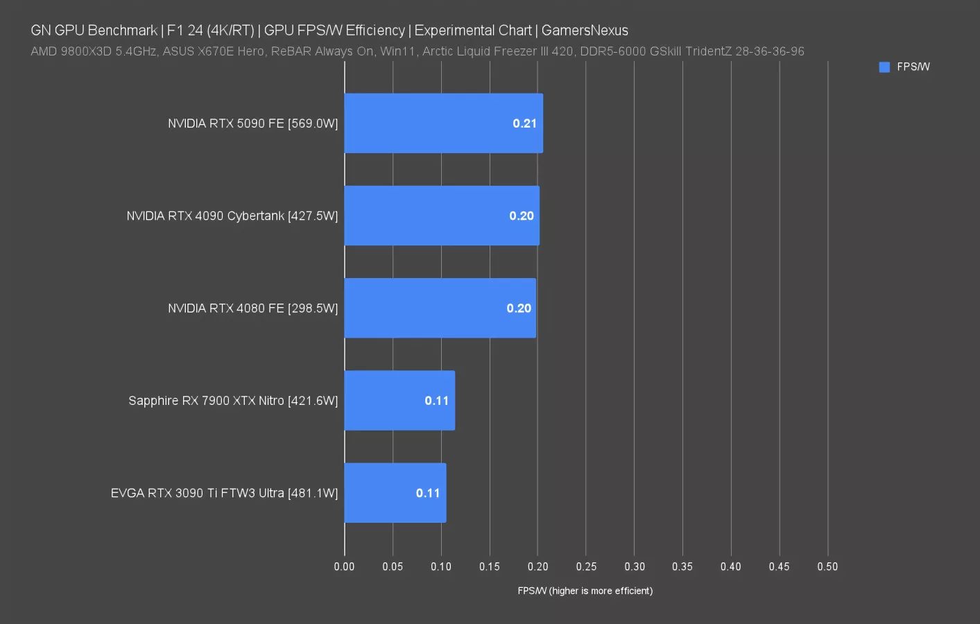 On a technicality, the RTX 5090 is the most efficient in this test. It pulled 569W on average during testing and had spikes up to 580-590W, and because of the framerate advantage over the RTX 4090 with its 428W draw, it ends up at 0.21 FPS/W instead of 0.20. This isn’t particularly exciting and we have to highlight that NVIDIA’s claims of efficiency improvements largely centered around artificially generating frames, which isn’t like-for-like because the frame itself may not be the same or comparable.