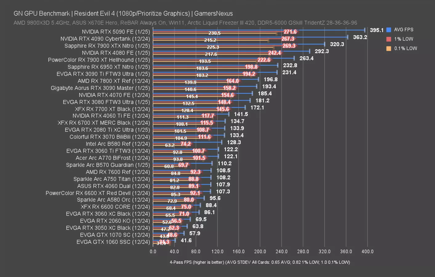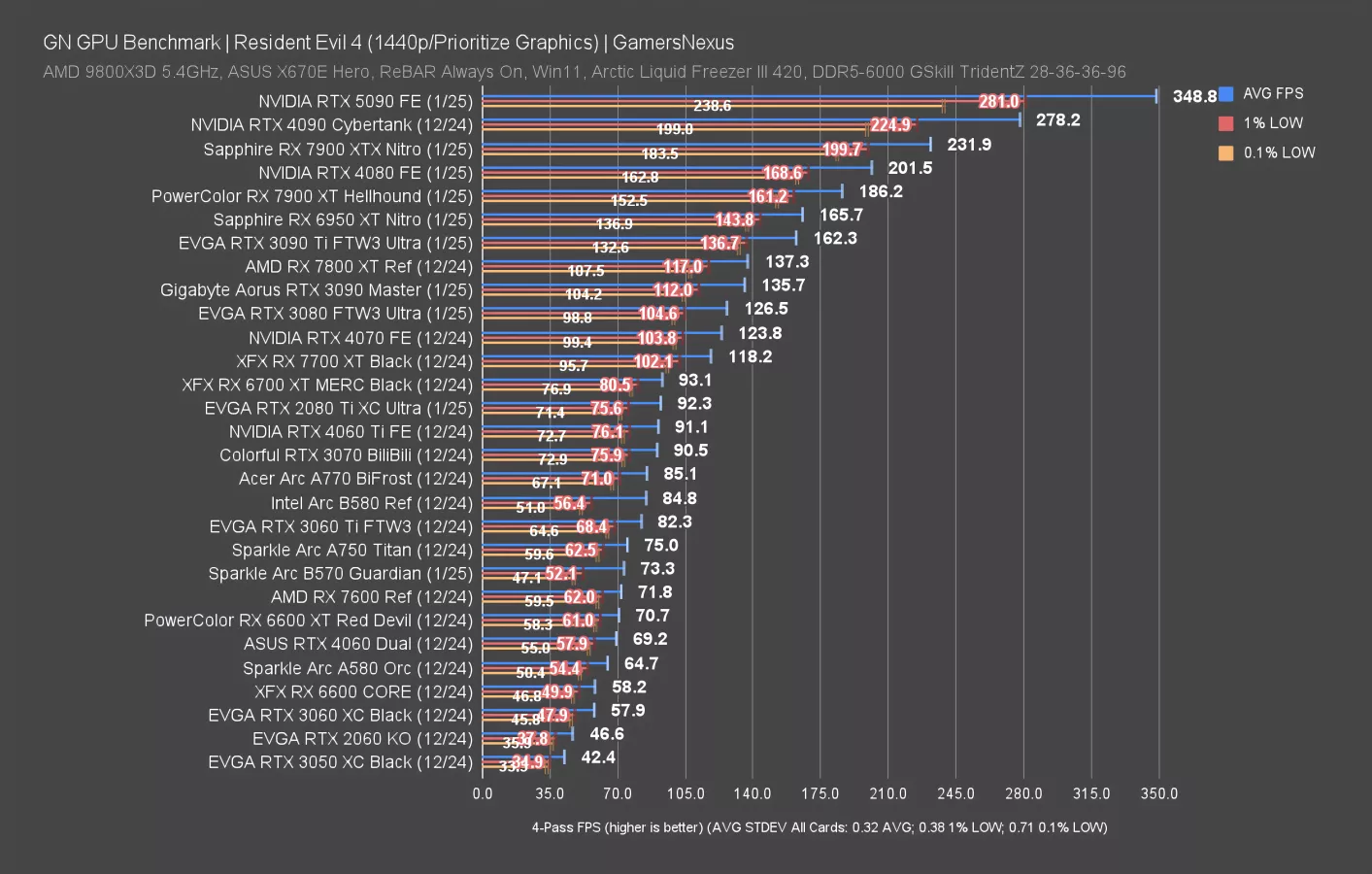 Resident Evil 4 with Ray Tracing is up now, tested at 4K first. The 5090 ran at 210 FPS AVG using FSR as defined in the chart title. The 160 FPS RTX 4090 result establishes a 31% generational improvement favoring the 5090.