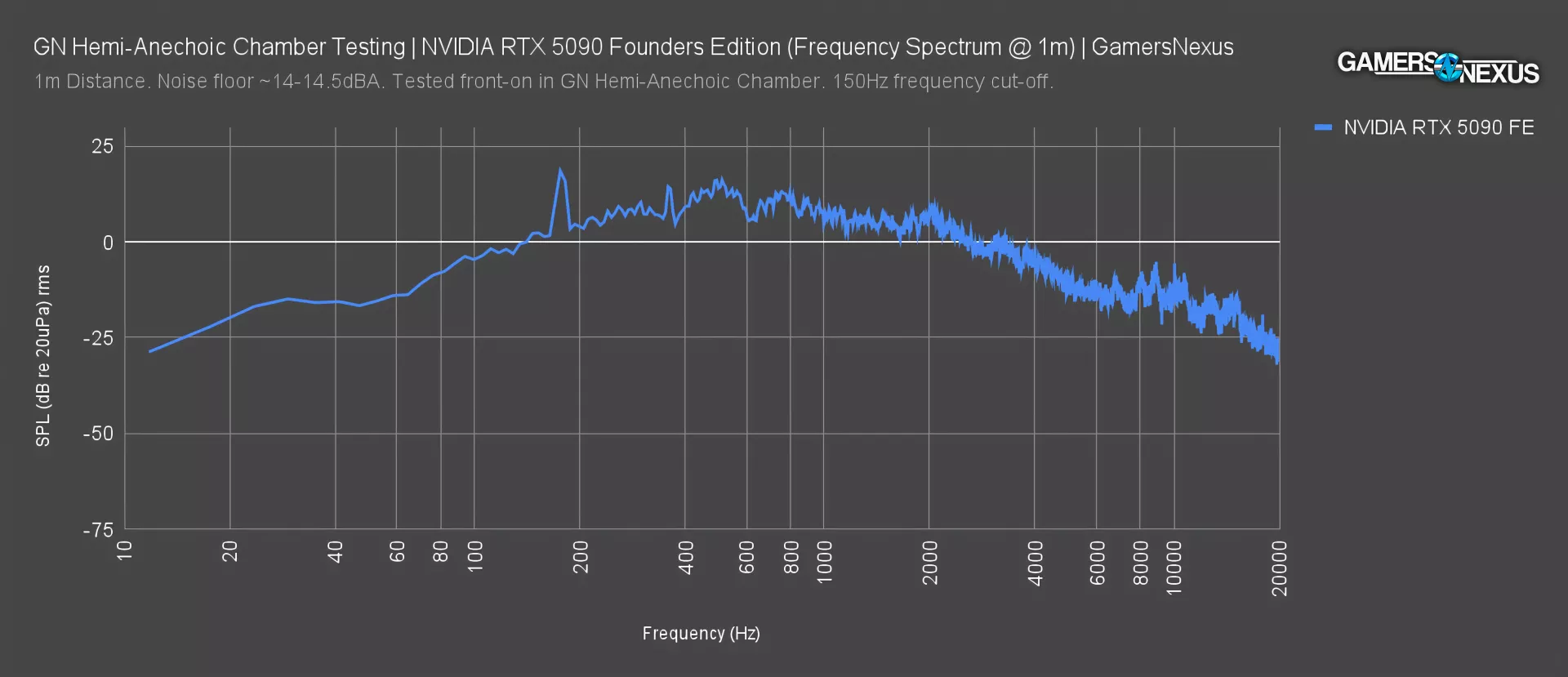 Here’s the frequency spectrum plot. In our acoustic chamber with a noise floor of about 14-14.5 dBA on the day of testing, the RTX 5090 was measured in our passive test bench at about 32.5 dBA total. That’s at a distance of 1 meter.