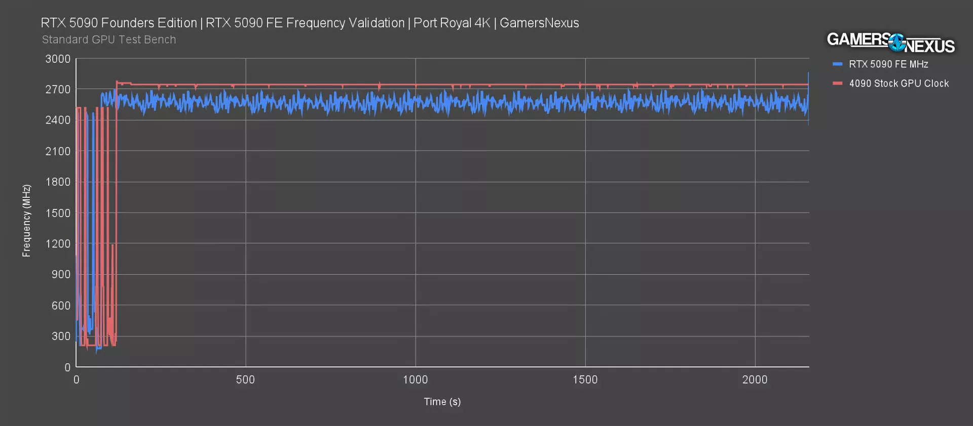 This next line plot is to ensure the GPU is functioning properly and meets the spec NVIDIA publicly claims. NVIDIA claims the 5090 runs at 2.01 GHz base and 2.41 GHz boost, with room for that to change based on the load. Assuming the software monitoring is correct for this new architecture, we measured about 2600-2700 MHz during the test, commonly 2600-2650 MHz.