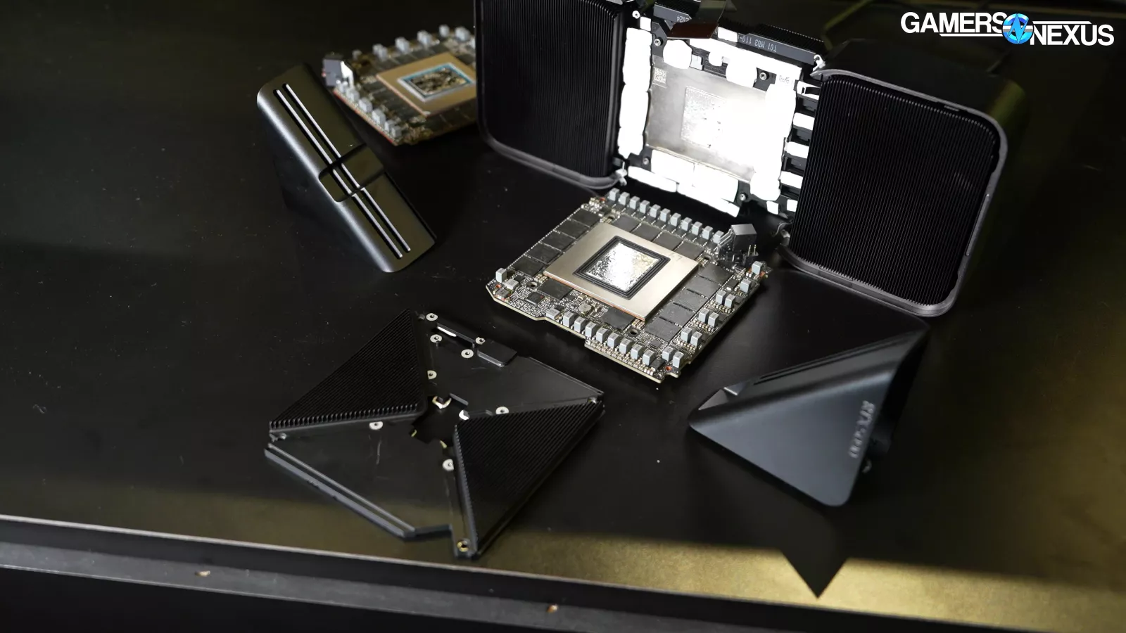 The RTX 5090 Founders Edition moves to a 2-slot design and uses a dual flow-through configuration, so they’ve sandwiched the PCB centrally and offset the PCIe slot to the side and down as a result. That also means that NVIDIA needs a separate PCB for the I/O that feeds monitors, connected via a flex cable to the main PCB. To get a 2-slot cooler capable of handling 575W or more, NVIDIA is using liquid metal with a triple-walled gasket to both contain the liquid metal and prevent exposure that could change its consistency and efficacy.