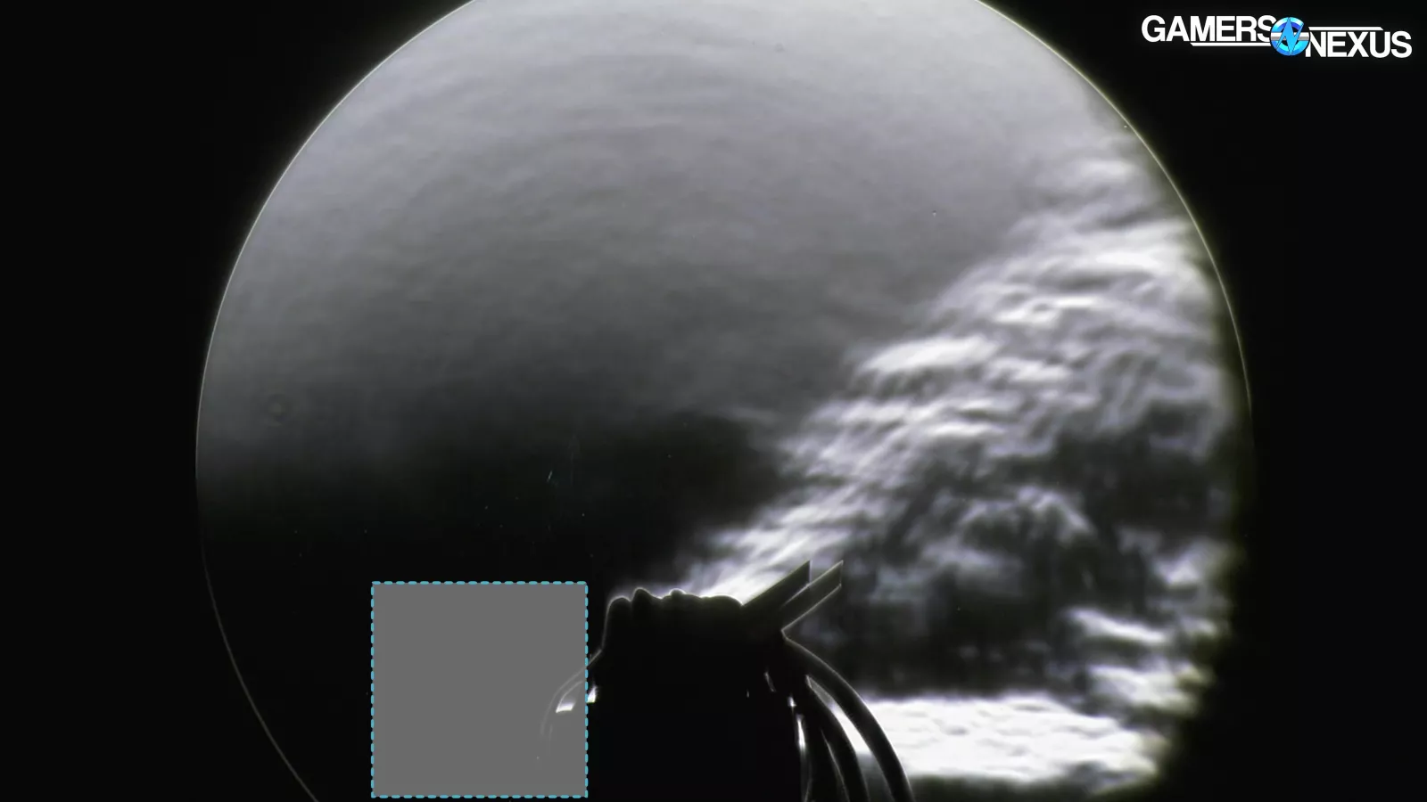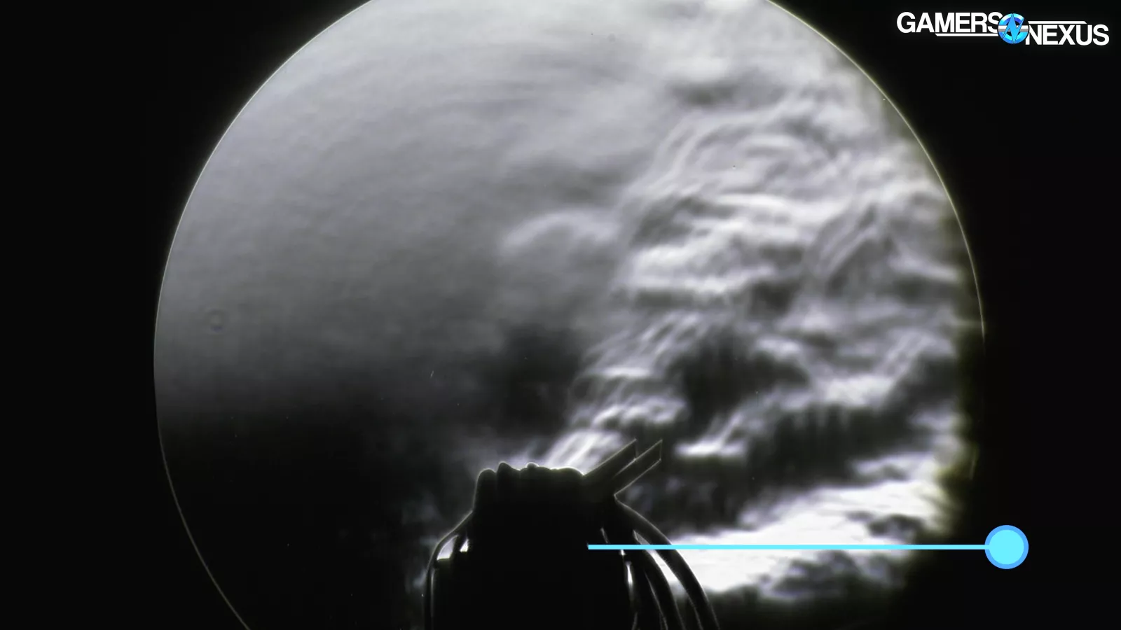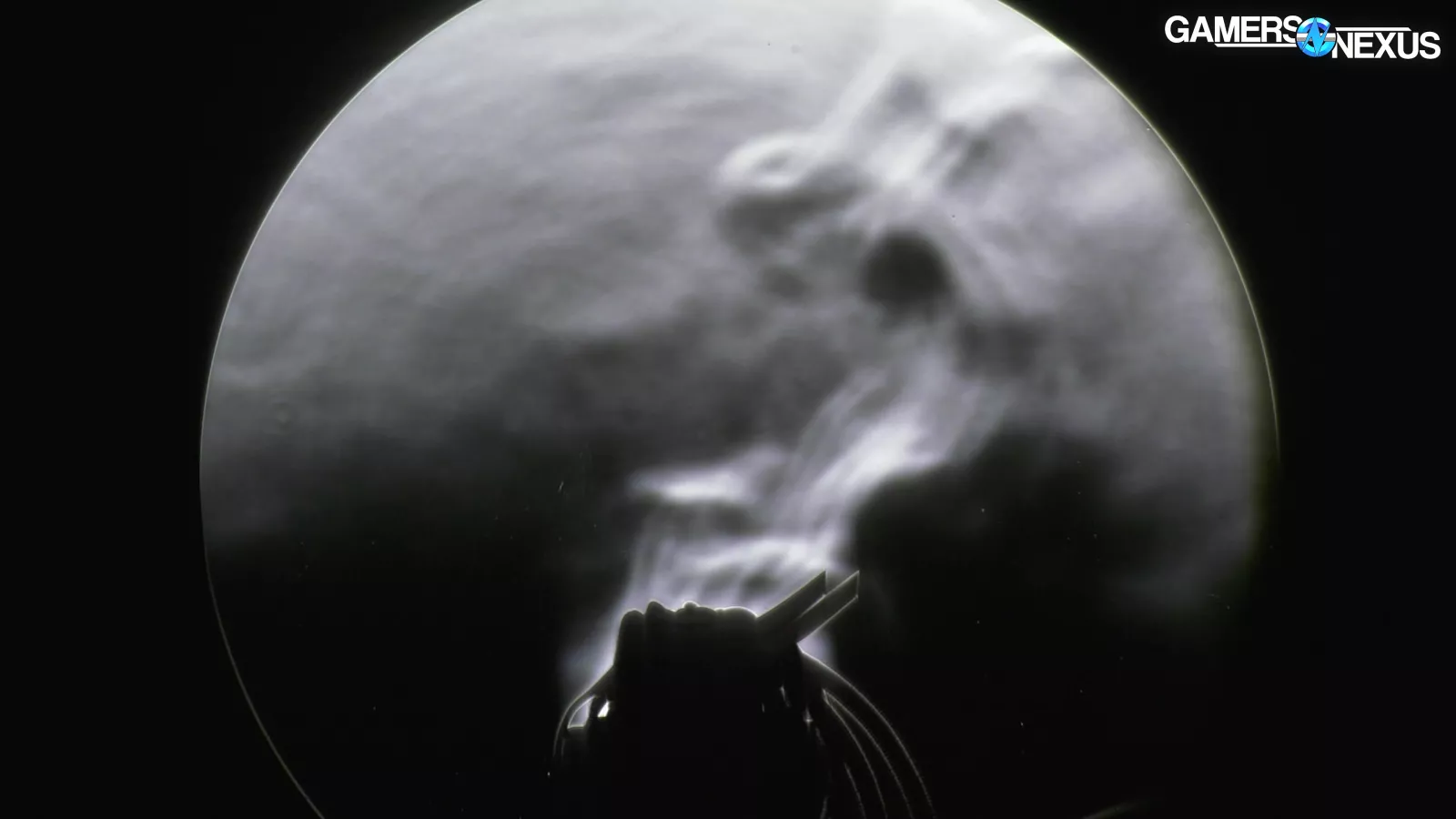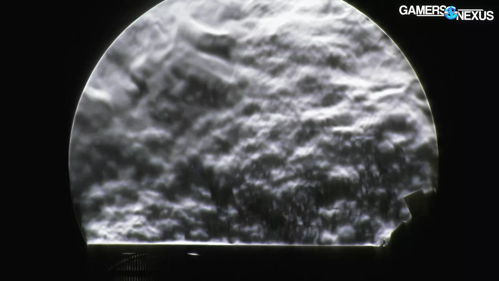As the fans turn on, we see a sudden flare-up and movement of air to the right through the flow-through area out the back and toward the CPU tower. What's super cool here is that we can see the air kick up and out to the right at a 20-30 degree angle or so. We also see a really high flow area of air exiting from the fins at the outer edges of the heatsink design. This hyper focuses the flow and reduces recirculation around the front area of the card, which just means the whole design is incredibly efficient at getting air away from the board and into case exhaust fans.