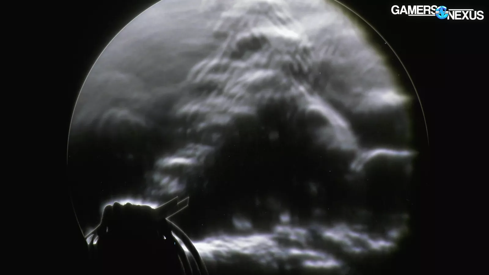 In this image, we're looking at the GPU straight-on, with it perpendicular to the camera frustum. This is when the fans are off but the heat load has already started. You can see the density change as the hot air leaves the card passively.