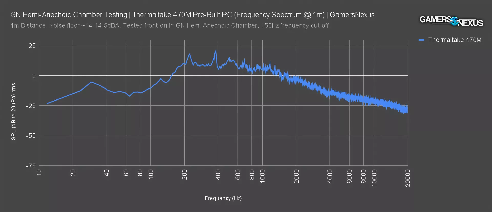 The Thermaltake 470M under steady state full load had its largest spikes at the 223 and 380 Hz frequencies, followed by a dip, then another small spike at 500 Hz. Overall, this noise profile is fine. There is a slight spike at 1600-1700 Hz which could be flattened a bit by lowering the pump speed and CPU cooler fan speed slightly, but overall, there’s not a lot to complain about with it.