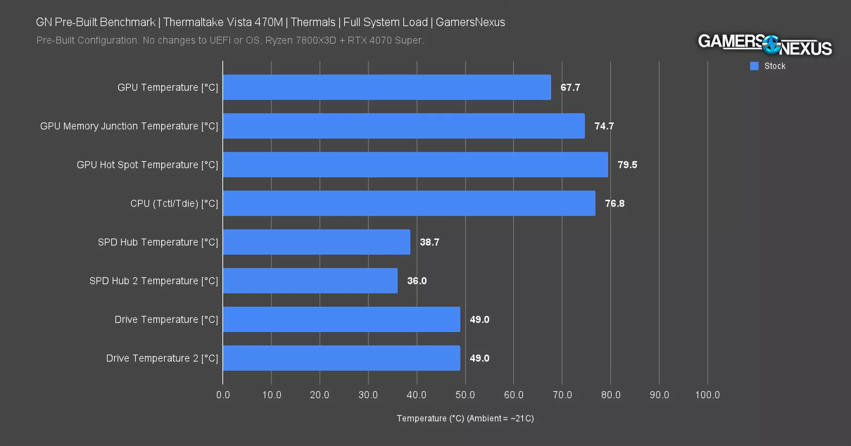 Thermals across the whole build are well managed, with CPU and GPU temperatures within expected ranges. Fan curves and acoustics are also good, with the one exception being the chassis fans never ramping up.