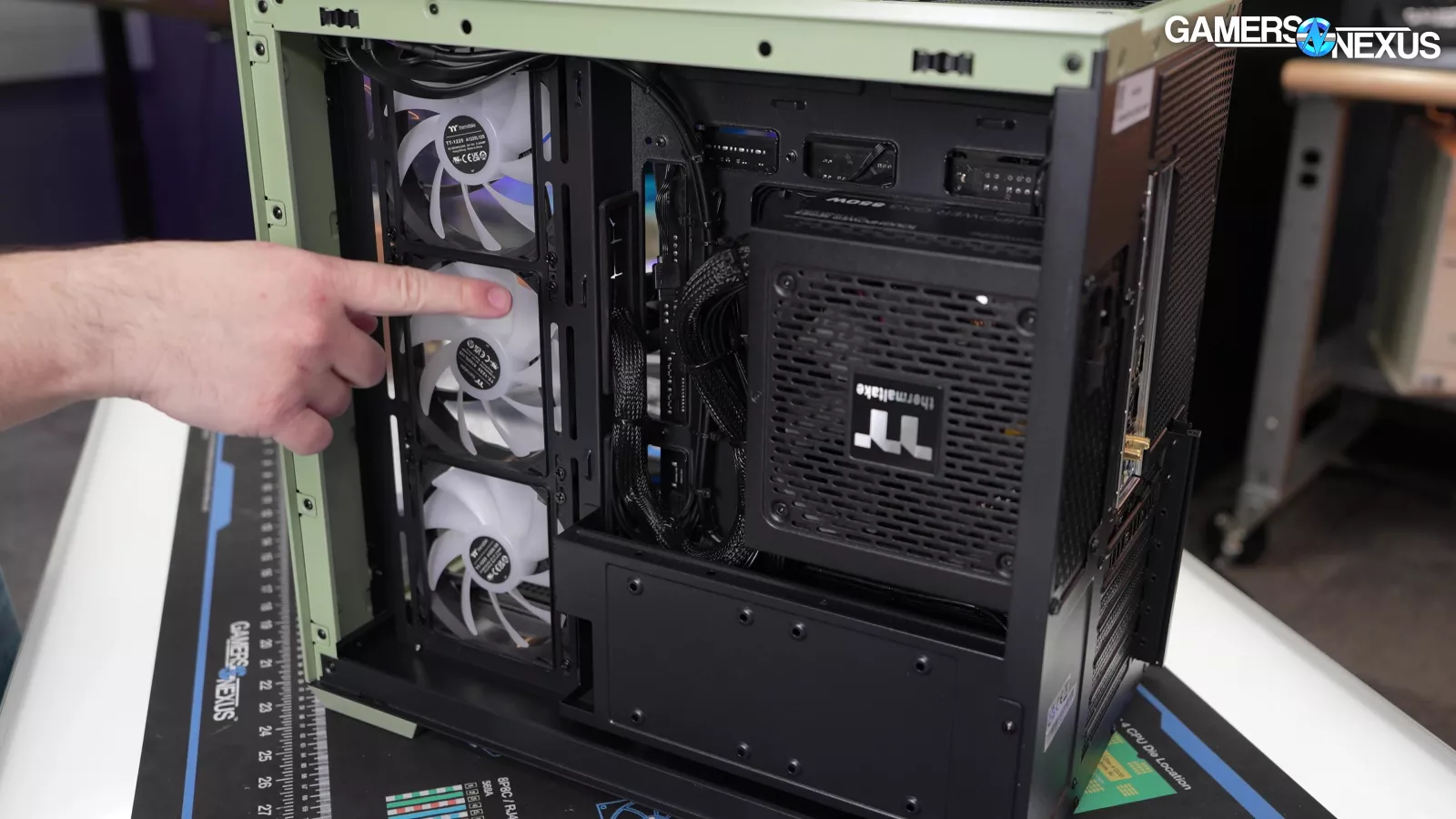 Thermals are relatively hard to screw-up in this case since it’s so heavily perforated and includes 3 side intake fans, a 240 liquid cooler, and a rear exhaust fan. Thermaltake did not screw them up, so that’s also a good sign. Overall, the cooling configuration is good and performs well for what it is. We don’t have any problems with the CPU or GPU temperatures here.
