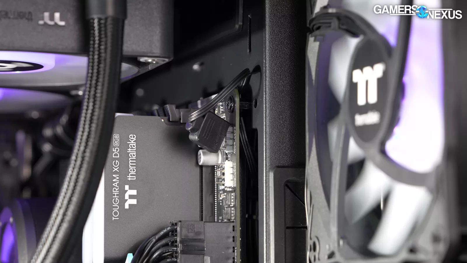The bag of accessories inside the case has the case manual, SATA cables, WiFi antennae, extra screws, and, curiously, two 12VHPWR adapters. One of them is the official NVIDIA adapter that probably came with the 4070 Super and the other is a mismatched-white that just looks bad. Nothing in the build is white themed, so we assume this was an accidental inclusion. Including the native NVIDIA adapter is good though, as there are a lot of reasons a user may want it in the future. Keeping the card’s accessories with the card is the right move and we’re happy to see it. Some SIs just toss the extras, which could minimally pose issues for second-hand resale when done with the system.
