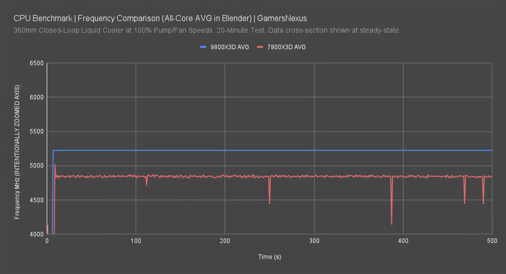 The 7800X3D averaged between 4800 and 4890 MHz during the original review cycle for this same test. It’s significantly lower and less fixed, shown by the line’s variability.