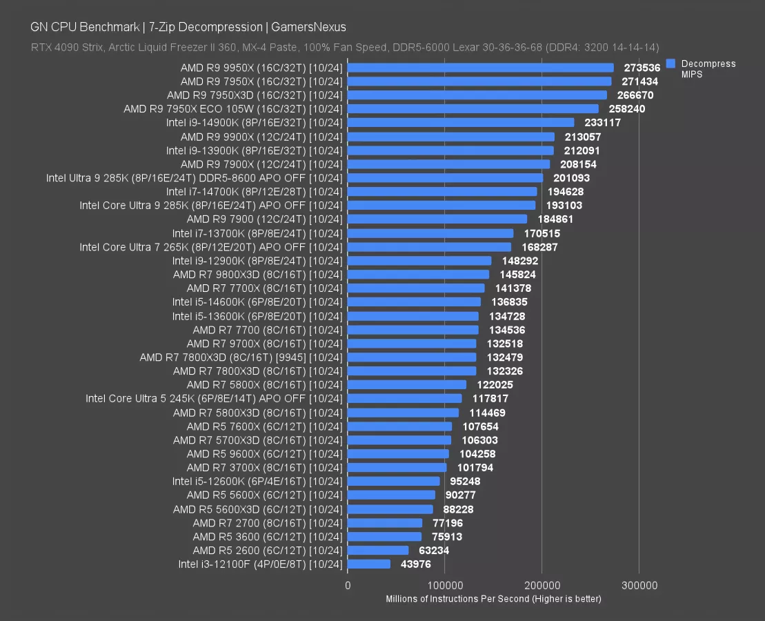 Decompression has the 9800X3D at 146K MIPS. It’s between the 12900K and 7700X (watch our review). The 9700X was regressive in this test against both the 7700X and the more like-for-like power 7700.