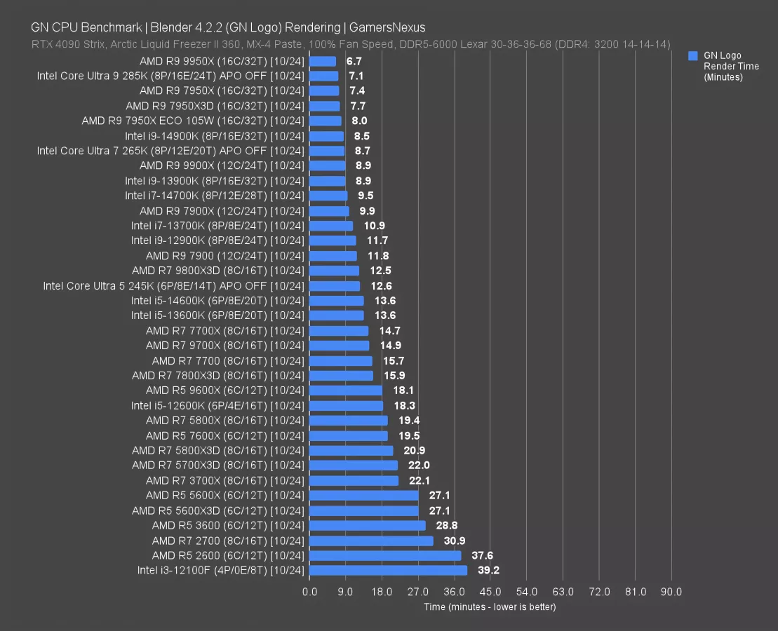 The 9800X3D completed the frame render in 12.5 minutes, about tied with the Intel 245K (read our review). Although we don’t recommend the part, the 245K is cheaper at $320. AMD’s 9800X3D manages to at least outperform the 9700X, with an atypical render time reduction of 16%. It’s atypical because prior X3D parts do not necessarily see such gains, such as the 7800X3D at 15.9 minutes to the better results from both the 7700 (watch our review)and 7700X. The reason for the atypical gain is largely the power budget, where the 9800X3D has more power available out-of-box to clock up.