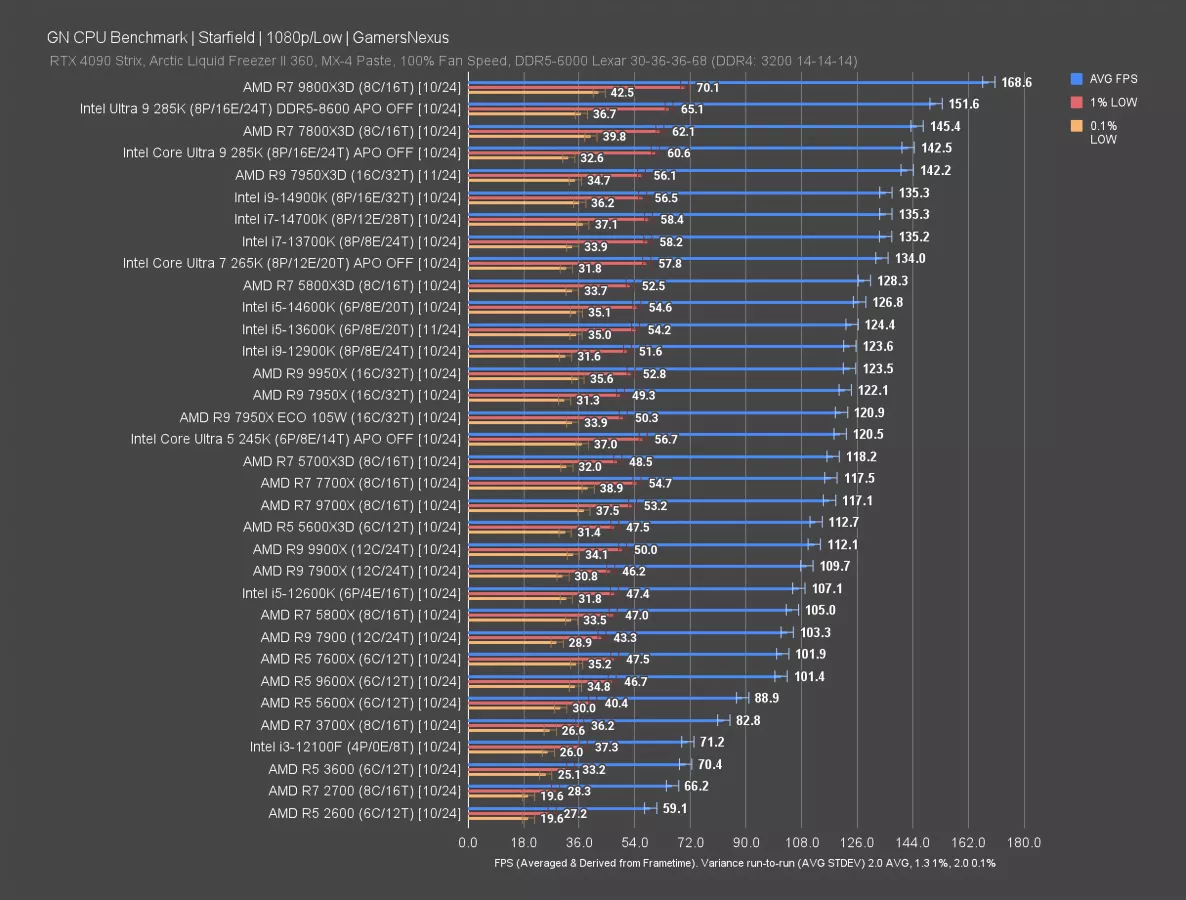 The game has the 9800X3D way up at 160 FPS AVG, leading the 7800X3D by an obscene 26.9%. The 7800X3D in both our shown dataset and our unshown additional tests have it in the 124-126 FPS range. This was one of the games we double-checked and got the same results each time.