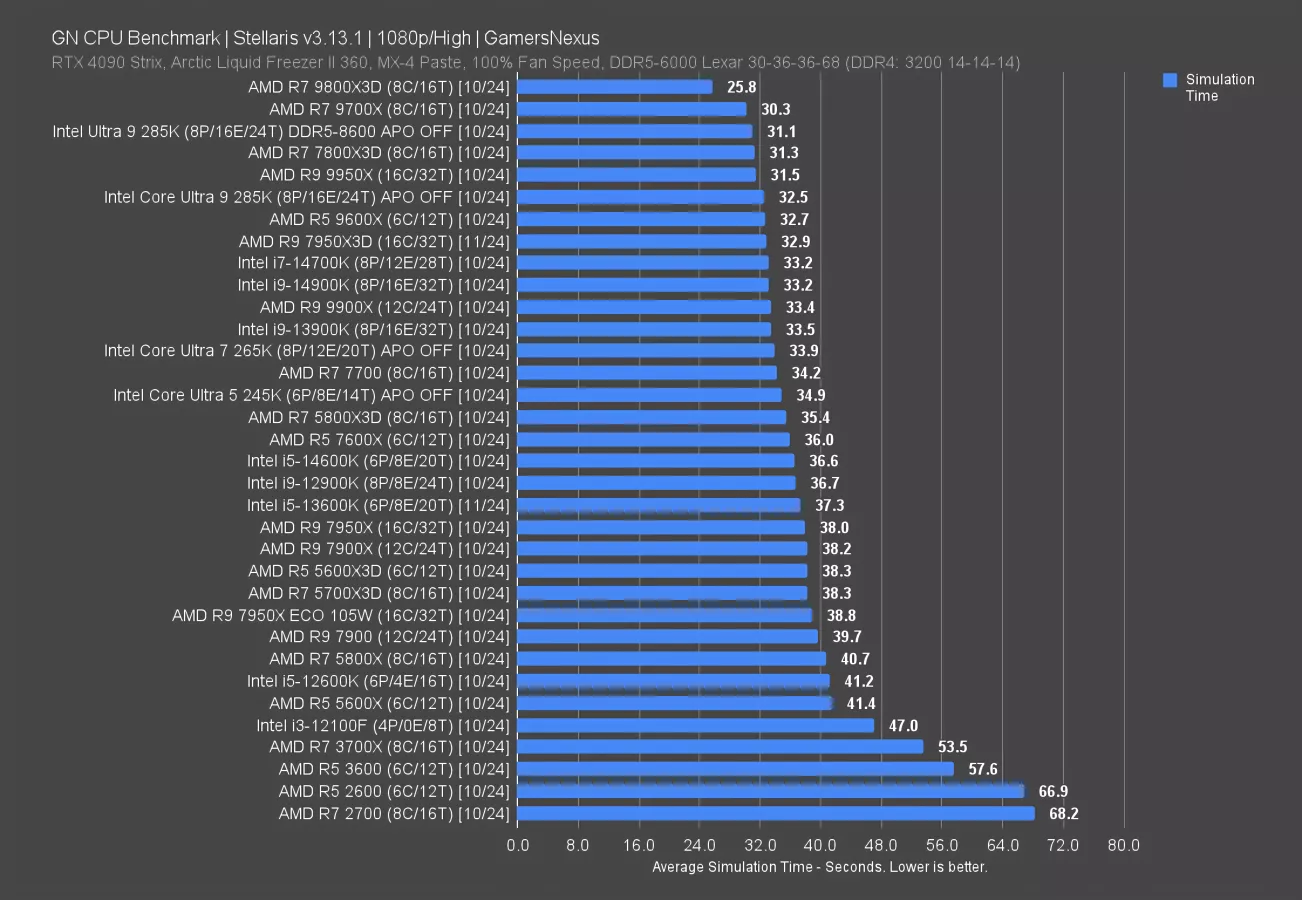 Intel’s best showing is the 285K with faster memory, but that’s not a like-for-like comparison as we could boost memory on AMD also. The 285K stock required 32.5 seconds to complete the simulation, meaning the 9800X3D reduces time required by 21%. The 7950X3D shows why we haven’t retested it, underperforming overall for reasons explained in our review of the part. Even with the new data, it underperforms vs. the 7800X3D.