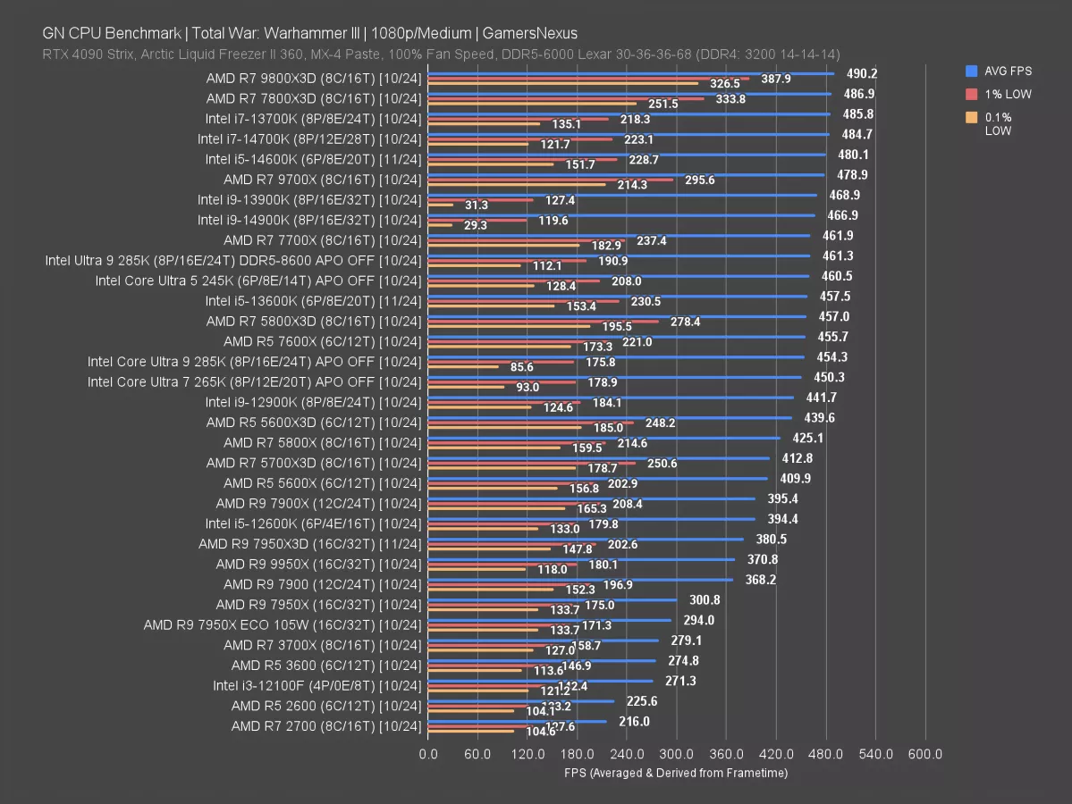 There’s only a 5% lead over the 14900K due to the same limitation, with an 8% advantage over the regressive 285K. The 5800X3D ran at 457 FPS AVG, so a 7% gain for the 9800X3D. The 14600K with its recent rerun we ran landed it up alongside the 14700K (read our review), with both encountering the same bottleneck as the 13700K and the 7800X3D. Sometimes people ask why a 13700K could be better than a 14700K. It isn’t: It’s just that we can’t actually see unbound scaling, limiting the usefulness of this test.
