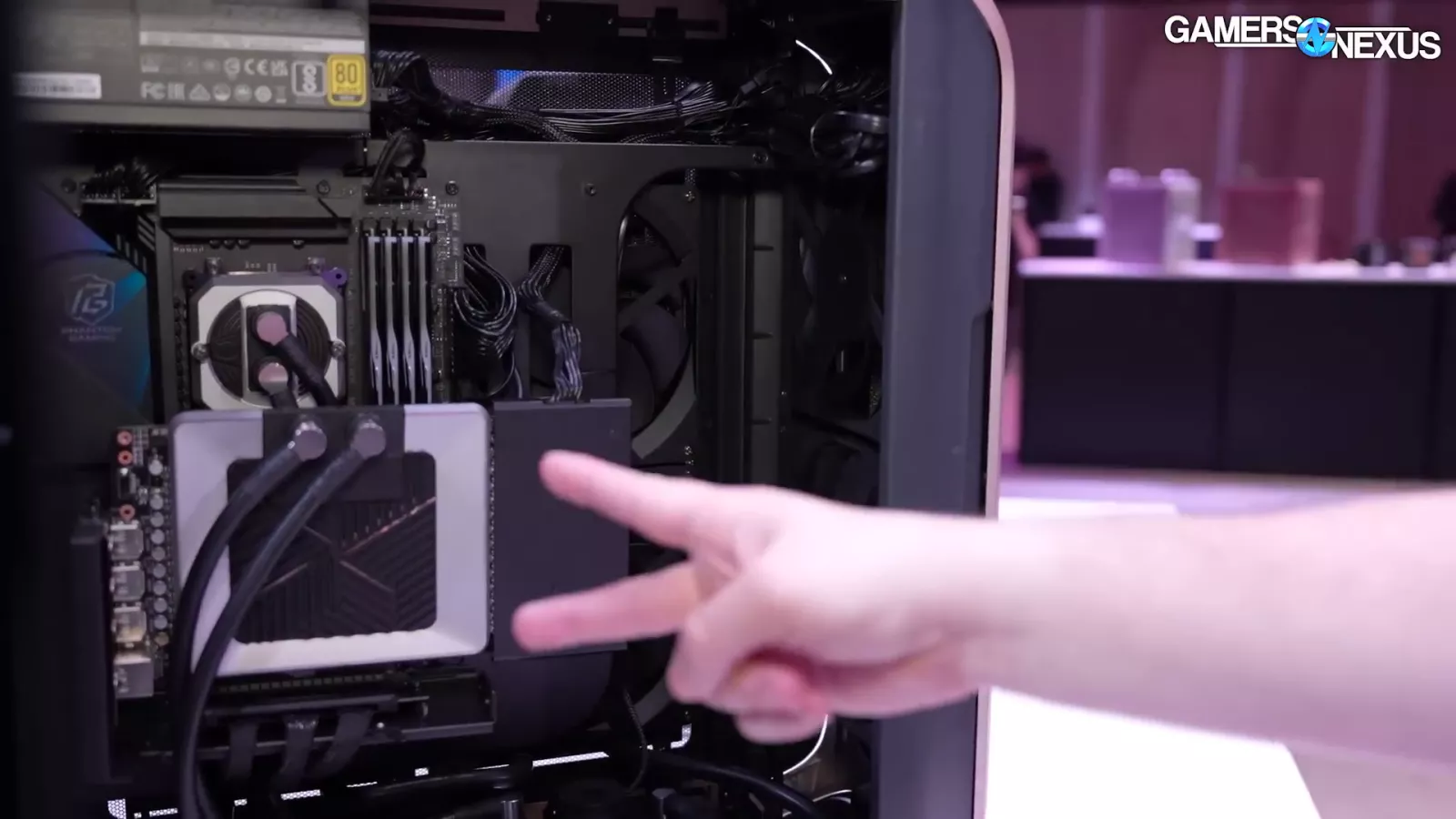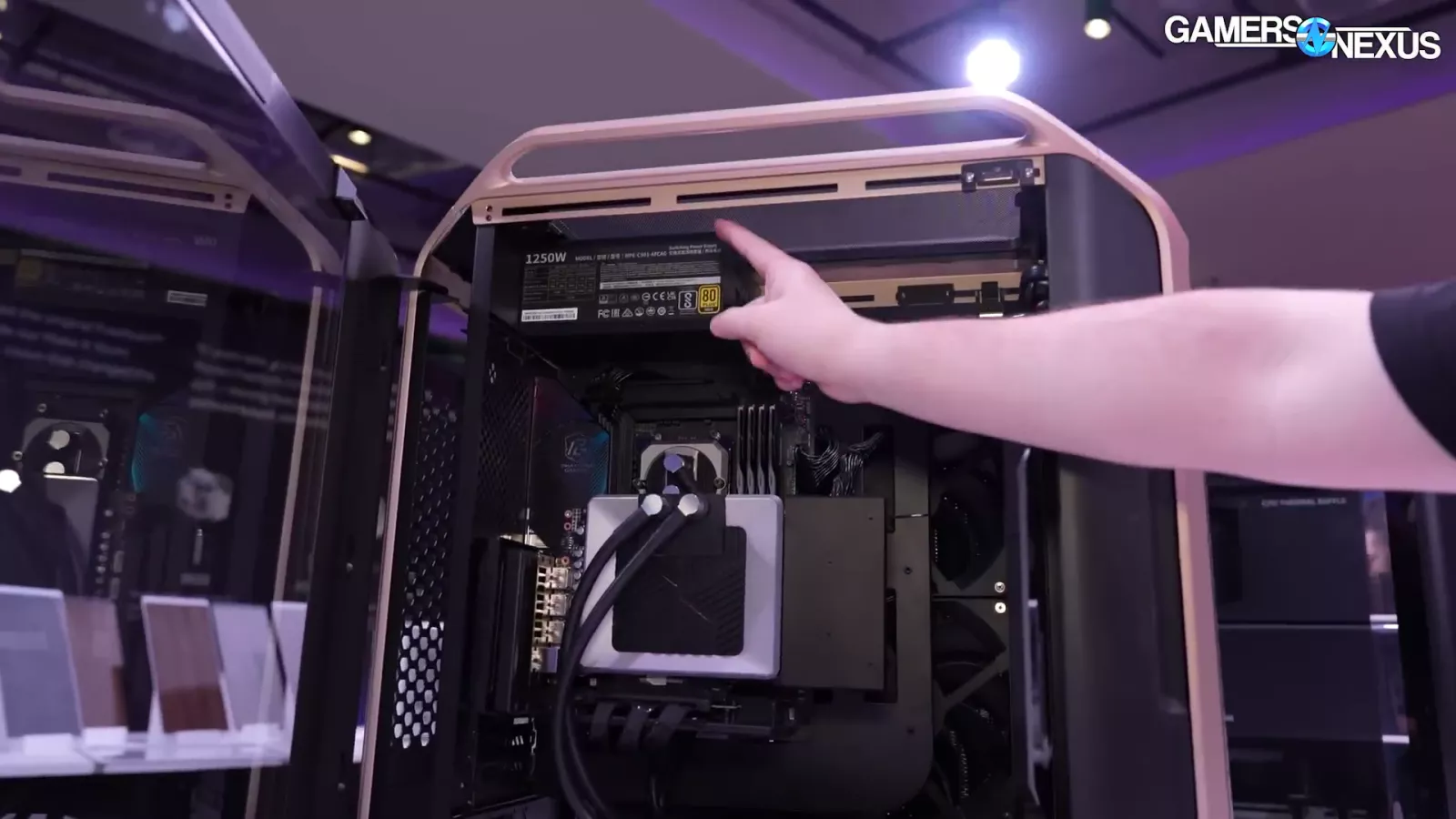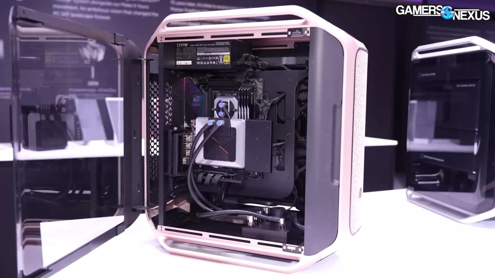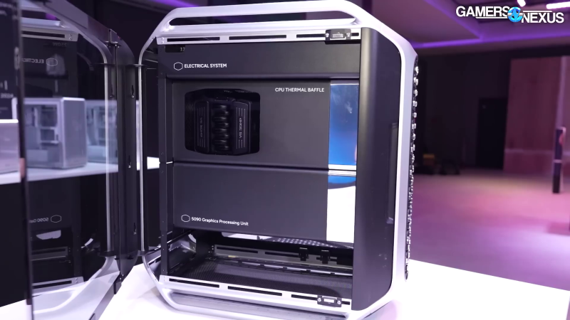 We also saw another variant of the Cosmos case running liquid cooling with a distro block. It was coupled with 4x180mm fans and a “720” radiator, which pulled air into the case. Unfortunately, the air is blowing straight into the wall of a motherboard tray, but Cooler Master says the plan is to pull the air up and out of the case with additional 180mm fans on the top and to move the PSU towards the bottom of the case.