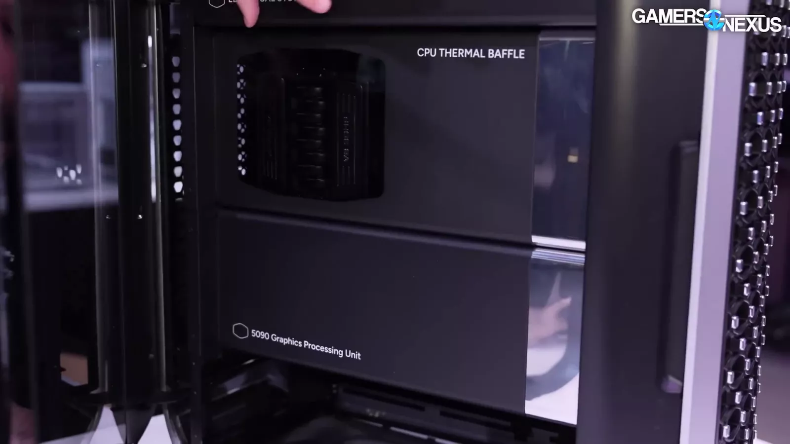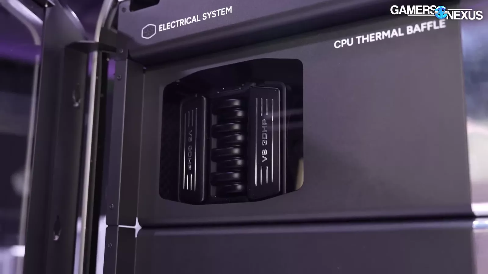 The way the baffles are designed, Cooler Master is trying to bring air straight in through its channels. There’s a channel for the CPU that exposes the fin stack and Cooler Master's V8 CPU cooler. It conveys an idea similar to an engine cover.