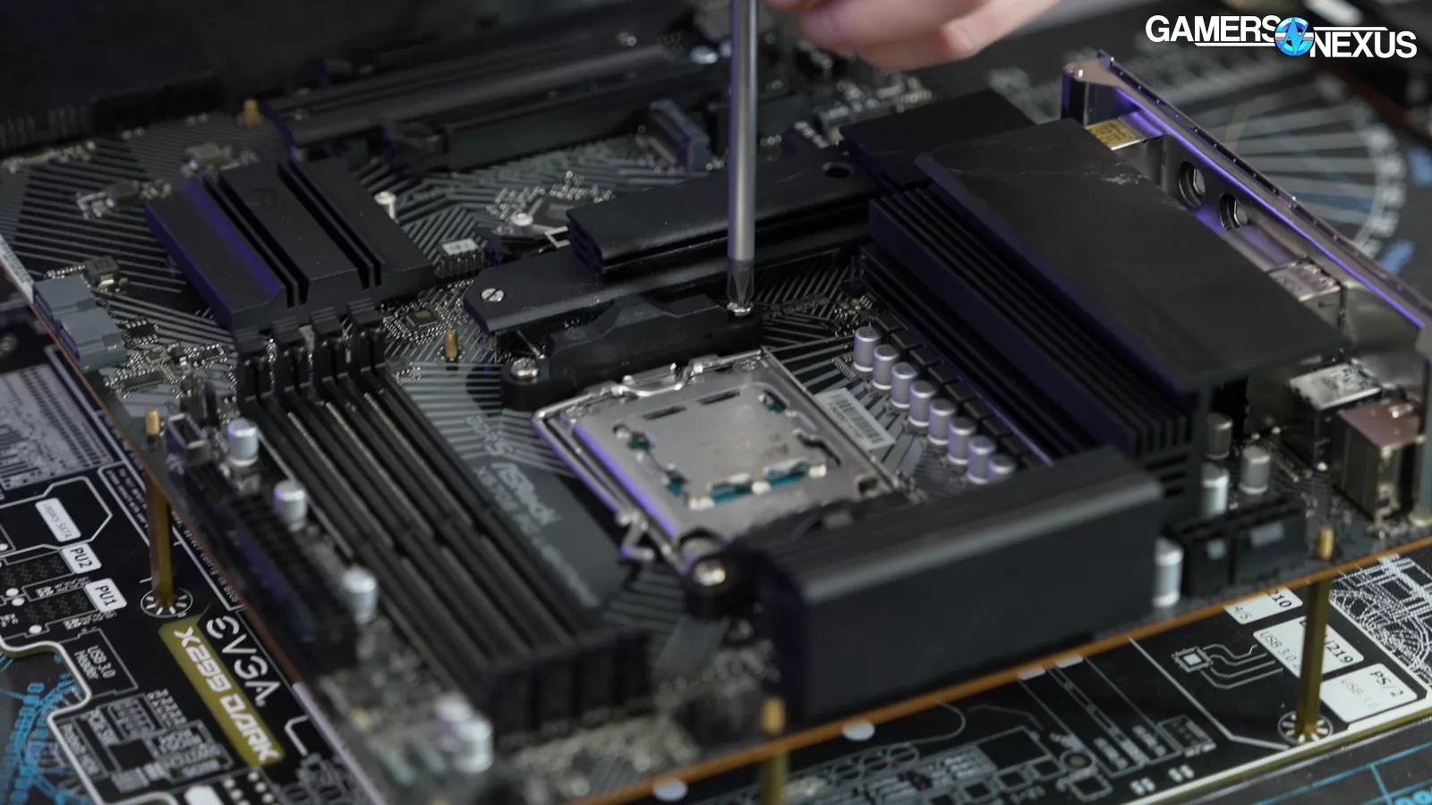 With the thermal paste applied, it’s time to place the cold plate down onto the IHS and tighten both screws.