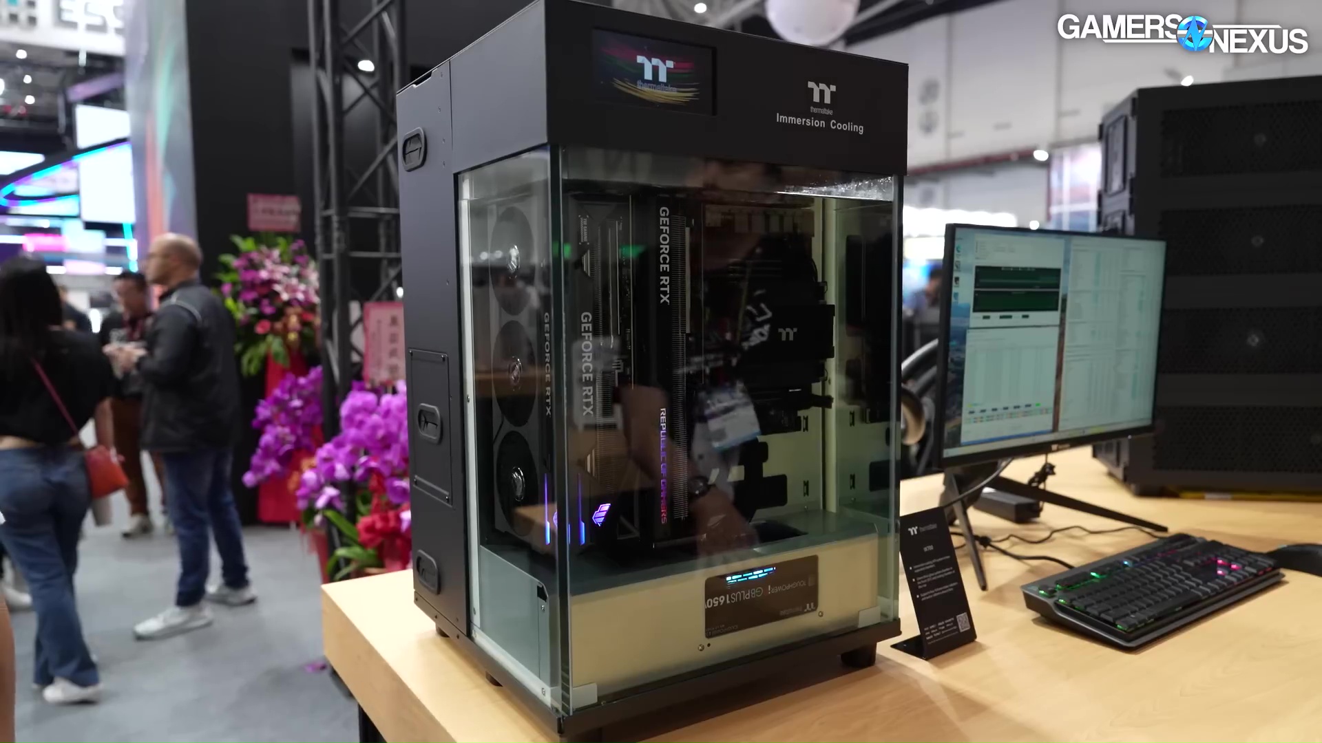 - Thermaltake’s full immersion cooling setup uses liquid and comically large hoses coupled with a massive radiator system